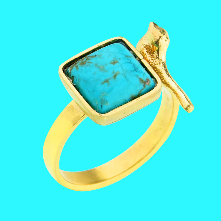 انگشتر زنانه گالری عزیزی مدل 15339 از جنس برنج و فیروزه است . این انگشتر کاملا دستساز بوده و با تکنیک اره کاری جواهر ساخته شده است ، از طراحی تا ساخت آن توسط گروه هنری گالری عزیزی انجام شده است . و همین امر باعث گردیده کسانی که به دنبال کارهای خاص و منحصر به فرد هستند بتوانن انتخاب خوبی داشته باشند درخصوص فلز برنج باید گفت این فلز بسیار برای بدن انسان مفید است و جزو کارهایی است که باید هر چند روز یکبار شستشو شود با آب صابون تا براقیت خود را حفظ کند . و اگر مدتی طولانی استفاده نکردید و کدر شد بهترین تمیز کننده در مرحله اول جلاسنج است و درصورت نبود جلاسنج ، رب گوجه فرنگی را روی کار بمالید و پس از چند دقیقه با آب و شوینده پاک کنید