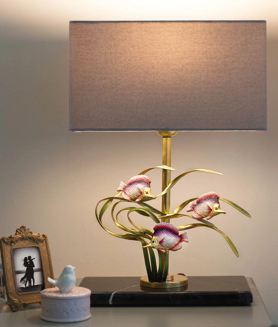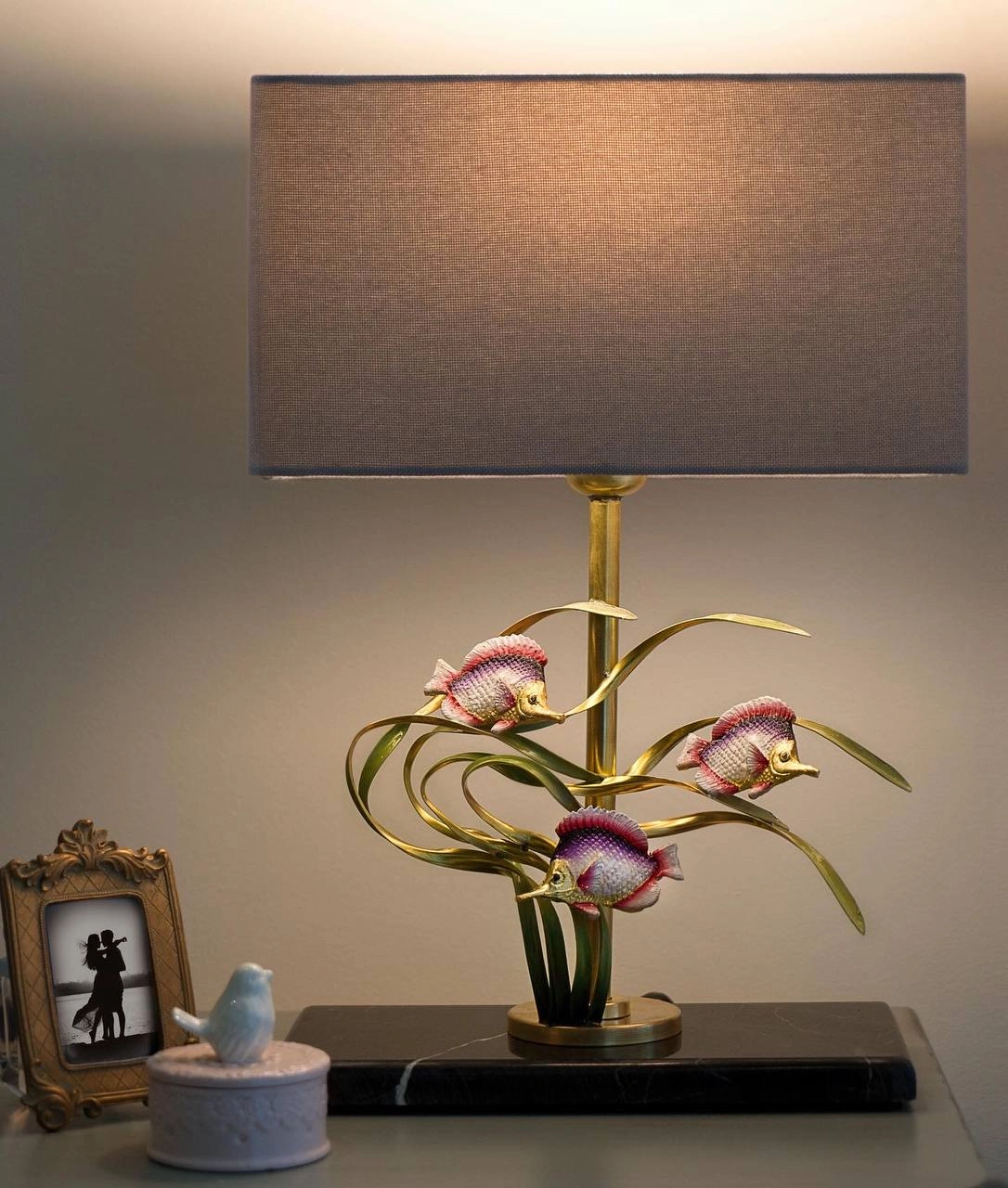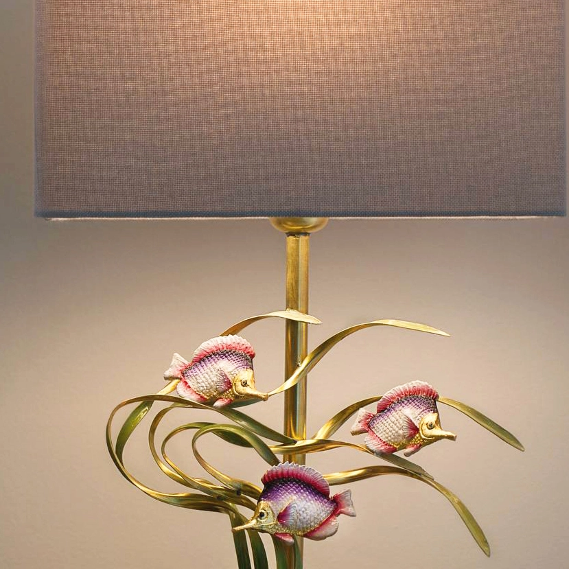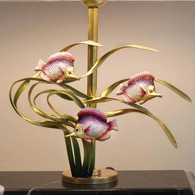 آباژور رومیزی دستساز برنجی گالری عزیزی طرح ماهی میناکاری
