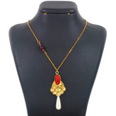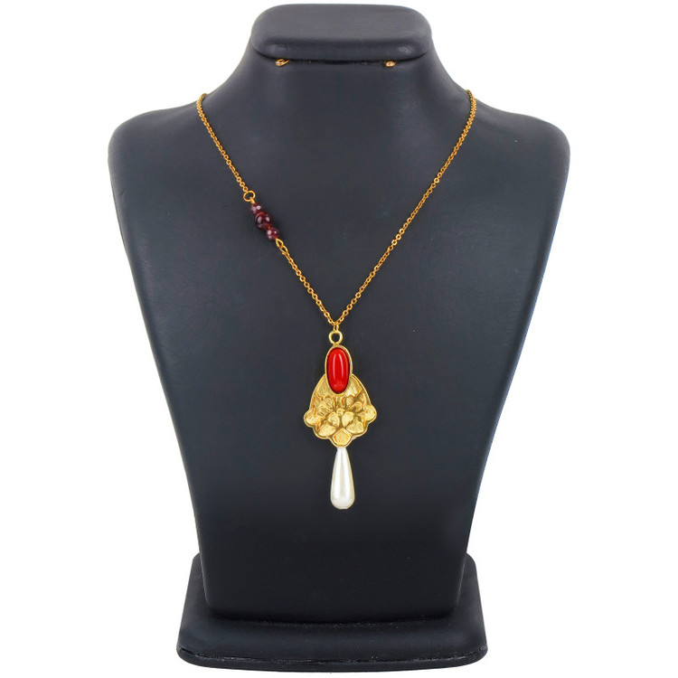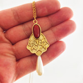 گردنبند زنانه گالری عزیزی مدل 14431 از جنس برنج و سنگ عقیق و مروارید است . این گردنبند کاملا دستساز بوده و با تکنیک اره کاری جواهر ساخته شده است ، از طراحی تا ساخت آن توسط گروه هنری گالری عزیزی انجام شده است . و همین امر باعث گردیده کسانی که به دنبال کارهای خاص و منحصر به فرد هستند بتوانن انتخاب خوبی داشته باشند .زنجیر این گردنبند با خلاقیت درست شده که از سادگی معمول را ندارد و با مروارید تلفیق شده است .