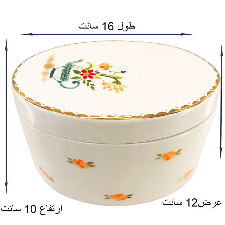 این شکلاتخوری دستساز و نقاشی زیرلعابی دستی روی آن کار شده که در دمای 800 درجه در کوره پخته شده است روی قندان لاستر طلا 18 عیار واقعی کار شده است