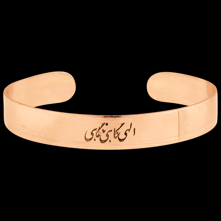 دستبند زنانه و مردانه طرح الهی گاهی نگاهی مدل 15492 از جنس مس است و با هنر قلمکاری اسم روی آن حک شده است . این دستبند تماما با فرایند هنر دست ساخته شده است ، گزینه عالی برای کسانی که از زیورالات مسی خوششان می اید میباشد . برای براق نگهداشتن مس به طور مرتب هر چند روز یکبار آن را با آب و صابون بشورید و با دستمال لطیف خشک کنید