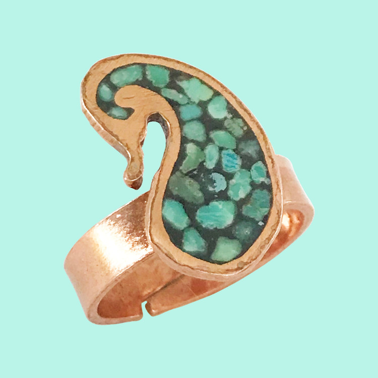 انگشتر زنانه گالری عزیزی طرح بته جقه مدل 15872 از جنس مس و فیروزه کوبی است و با هنر دست ساخته شده است . زیورهای مسی غیر از اینکه برای زینت استفاده میشوند برای بدن نیز مفید بوده و باعث افزایش ین های خون میگردد که کمک به بهبود گردش خون و بهبود بیماری رماتیسم میگردد . برای نگهداری آن کافیست زیورهای مسی را به صورت مرتب با آب و صابون یا هر شوینده دیگری بشورید تا همیشه براق تمیز باقی بمانند .