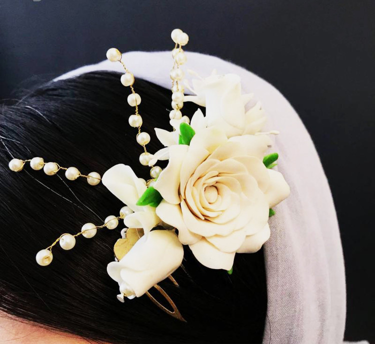 این شانه مویا گیره مو که از گل های به طرح گل رزسفید و غنچه رزسفید و شاخه های مرواریدی تشکیل شده است از جنس مواد مخصوص گلسازی ایتالیایی ساخته شده است ، مناسب برای شینیون موی سر عروس و خانم های خوش سلیقه می باشد. شانه سر گل رزسفید کد 98039 شامل چندین گل رزسفید که از خمیر گل سازی ایتالیایی ساخته شده است می باشد.