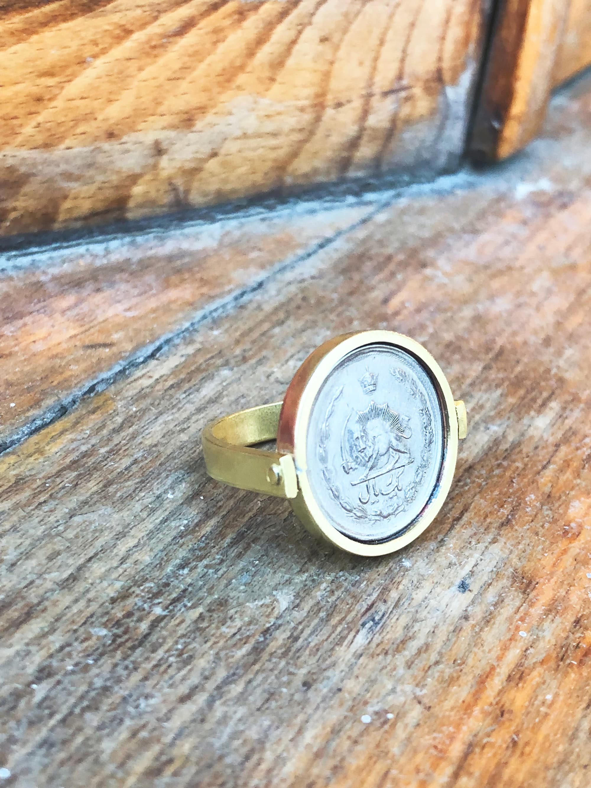 انگشتر گالری عزیزی طرح سکه پهلوی از جنس برنج و سکه واقعی است . سکه 1 ریالی زمان پهلوی که شیرخورشید روی آن است کار شده روی انگشتر مربوط به دهه 50 هست که برای بسیاری از مردمان ایران زمین حس نوستالژی دارد . این انگشتر بسیار یونیک و خاص است و گزینه ایده الی برای افرادی است که همیشه دنبال انگشترهای منحصر به فرد هستند میباشد انگشتر دارای قاب چرخشی که سکه را میتوانید بچرخانید داخل آن و از دو رو سکه استفاده کنید