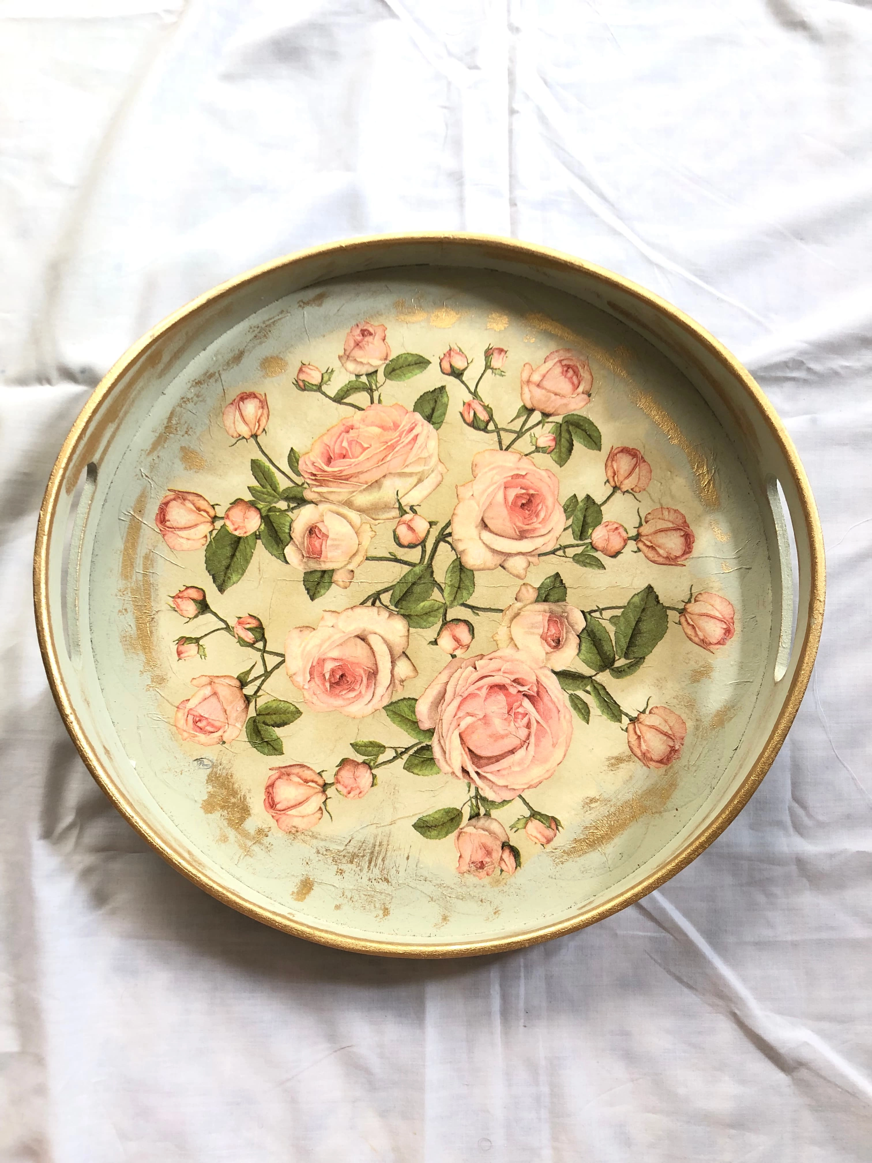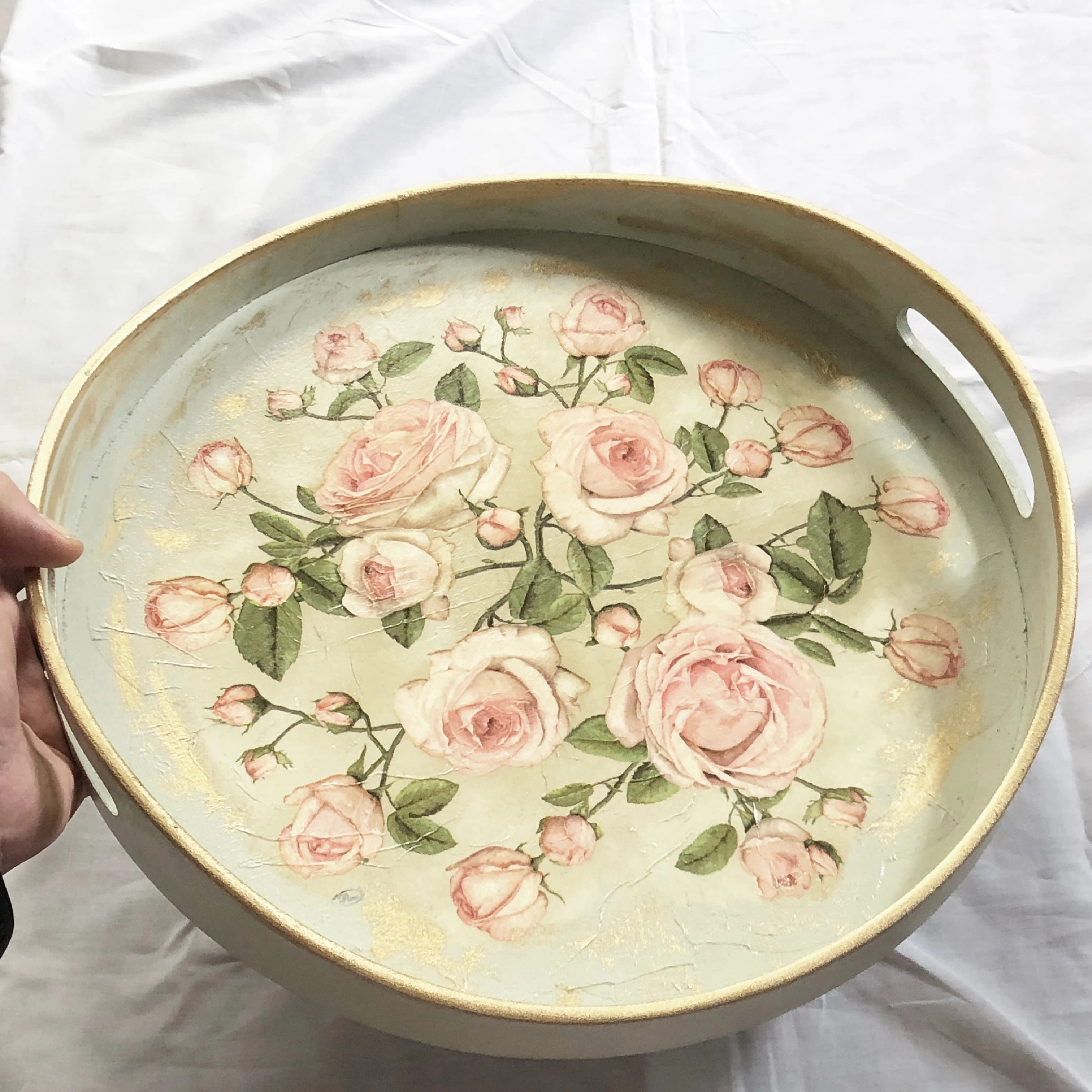 سینی پذیرایی دستساز گالری عزیزی مدل گل های رز از جنس چوب روسی و پتینه کهنه کاری و ورق طلا است که ویژگی هنری سینی با تکنیک کهنه کاری پتینه و نقاشی کف طراحی و ساخته شده است و از دیگر ویژگی های سینی این است که دستساز و هنر دست هنرمند ایرانی که تکنیک کاری هنری و ورق طلا و نقاشی کف سینی با هنر دست و چاپ انجام شده است