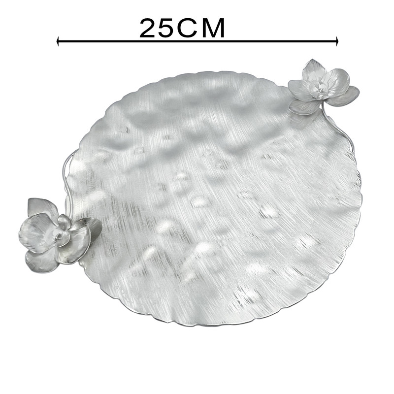 شیرینی خوری مدل گل ارکیده از جنس برنج است که روی آن با نقره 925 عیار آبکاری شده است و این تکنیک جدید آبکاری نقره رنگ ثابت است و قابلیت شستشو در ماشین ظرفشویی نیز دارد . تمام سطح ظرف چکش کاری دستی شده و گل ها همه با دست ساخته شده است .