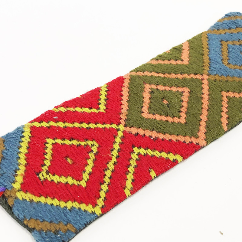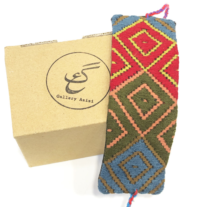 دستبند زنانه گالری عزیزی مدل 248 طرح سوزن دوزی از جنس نخ ابریشم و الیاف نخی توسط زنان سیستان بلوچستان با مهارت بالا و توانایی بینظیر در خلق این دستبند انجام شده است . این دستبند را میتوان به عنوان پابند نیز استفاده کرد