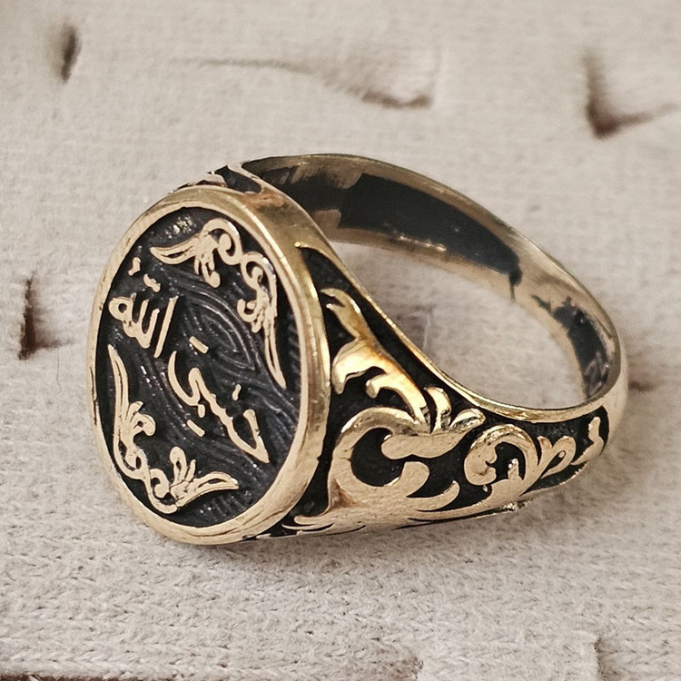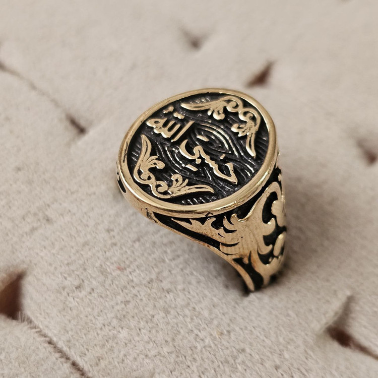 انگشتر مردانه از ترکیب آلیاژهای مس و روی بدست می آید و با تکنولوژی دستگاههای پیچیده ای بصورت طلا آبکاری شده و رنگ آن ثابت است. این انگشتر با نام مبارک حسبی الله ؛ زیبایی خاصی به انگشتان دست میدهد