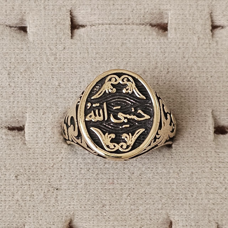 انگشتر مردانه از ترکیب آلیاژهای مس و روی بدست می آید و با تکنولوژی دستگاههای پیچیده ای بصورت طلا آبکاری شده و رنگ آن ثابت است. این انگشتر با نام مبارک حسبی الله ؛ زیبایی خاصی به انگشتان دست میدهد