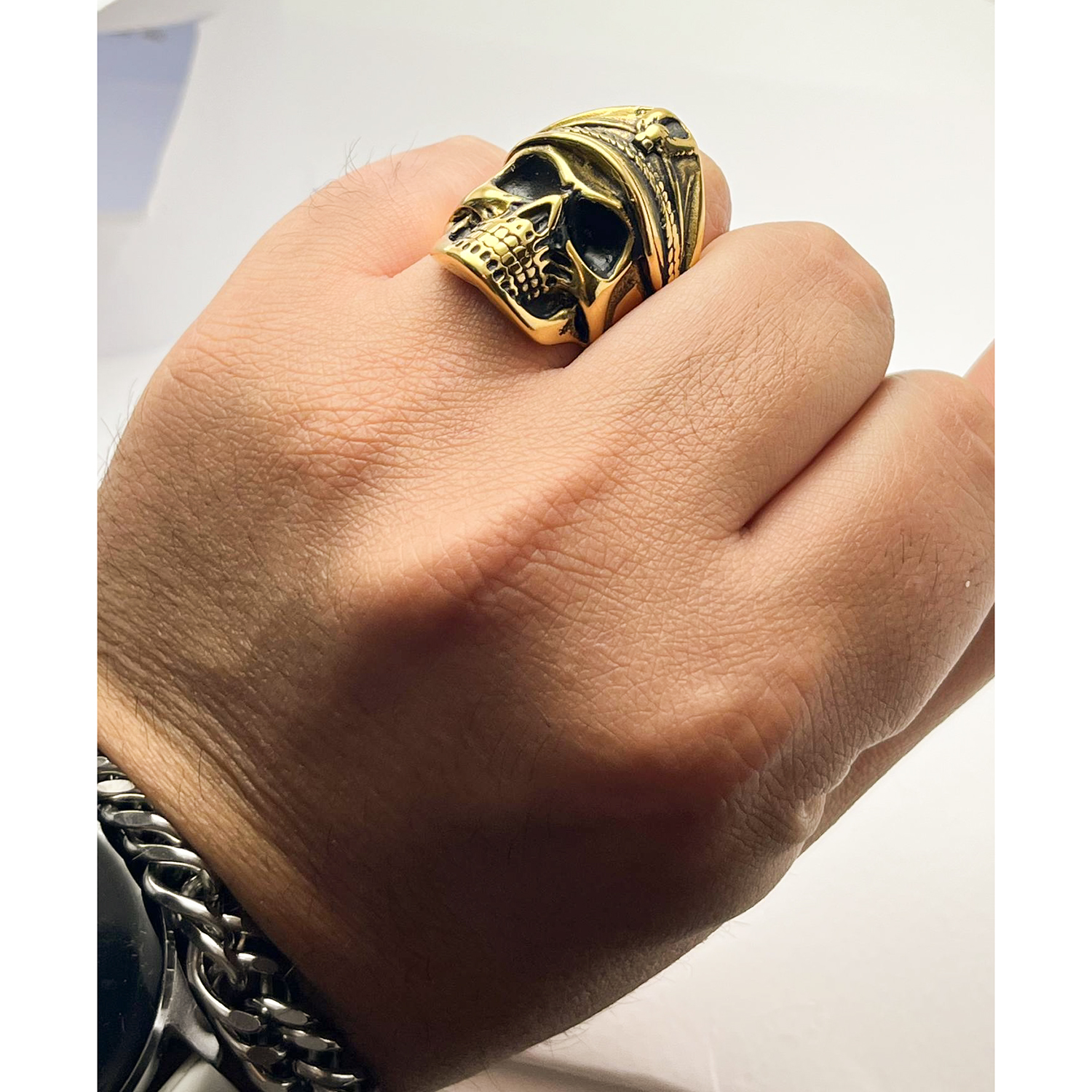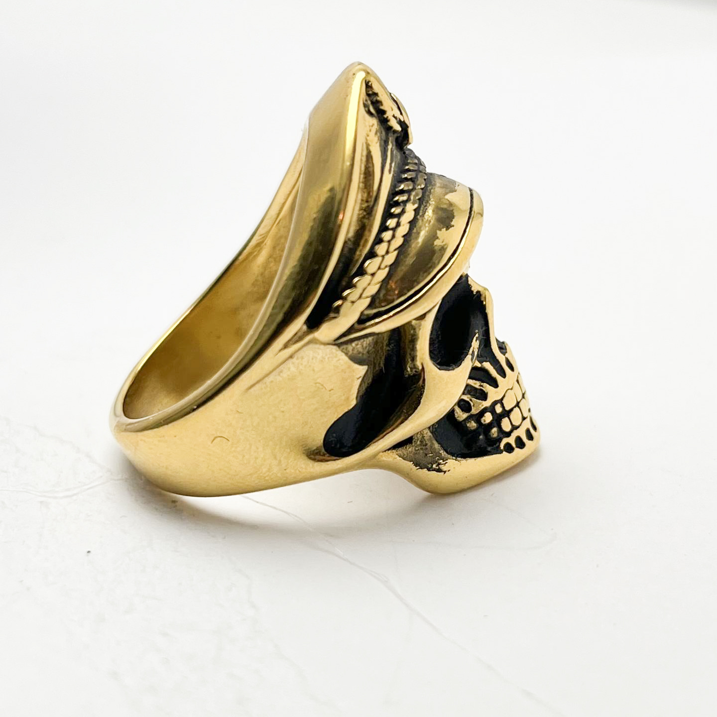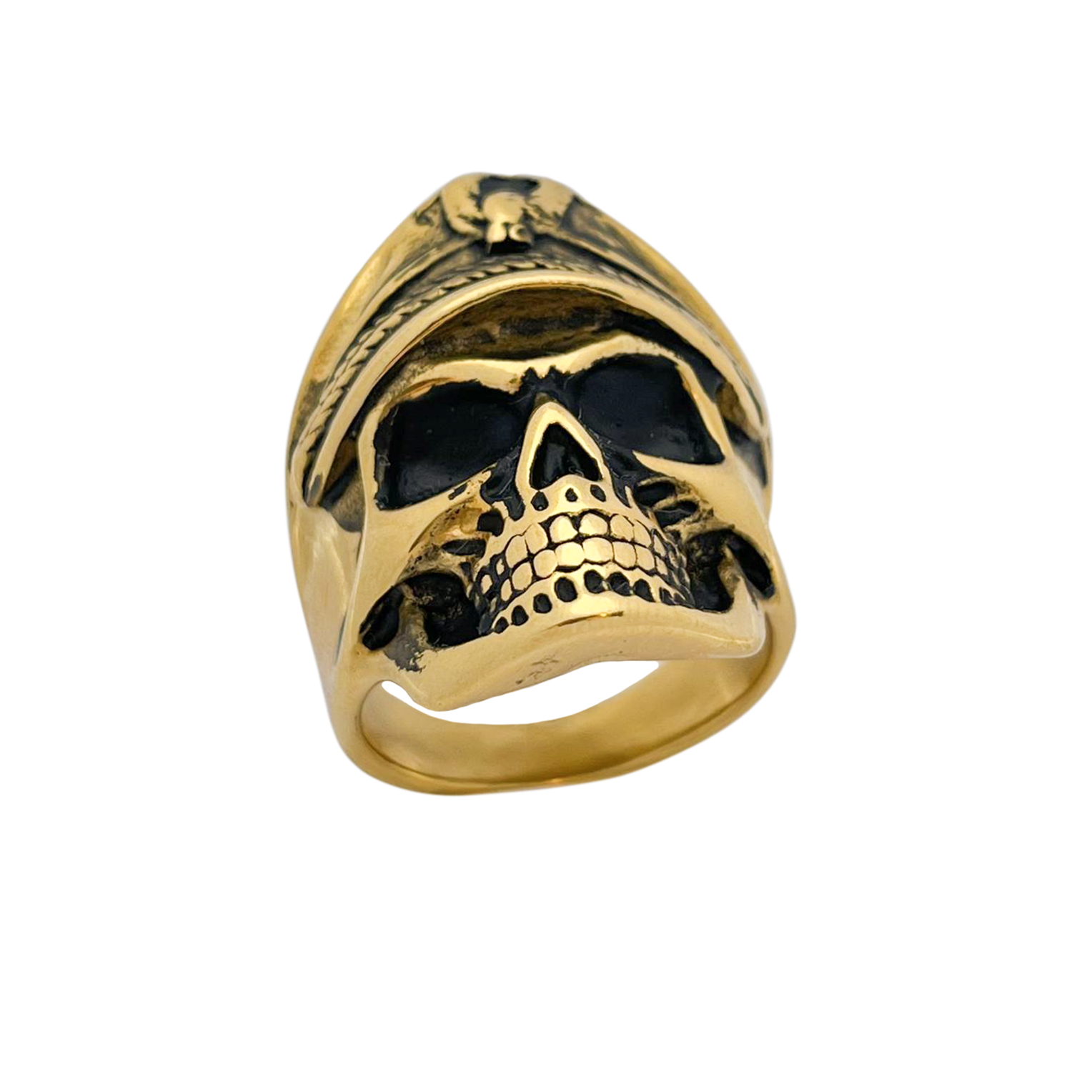 در ساخت این انگشتر، تمامی جزئیات اسکلت و فرم کلاه با دقت و توسط هنرمندان گالری عزیزی تراشیده شده تا جلوهای خاص و ماندگار به خود بگیرد. رنگ طلایی گرم آن با سایههای تیره زیر چشم و دهان اسکلت، کنتراستی خیرهکننده ایجاد کرده و حس اصالت و قدرت را به بیننده منتقل میکند.