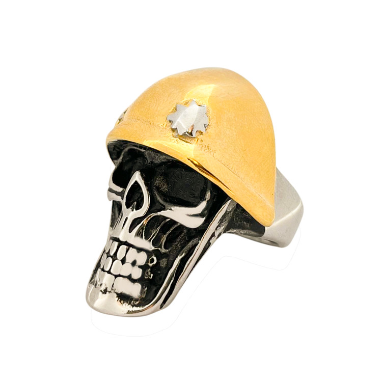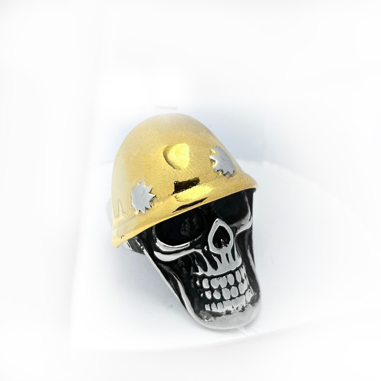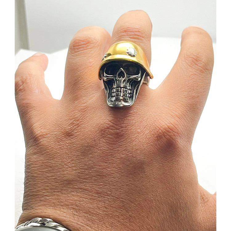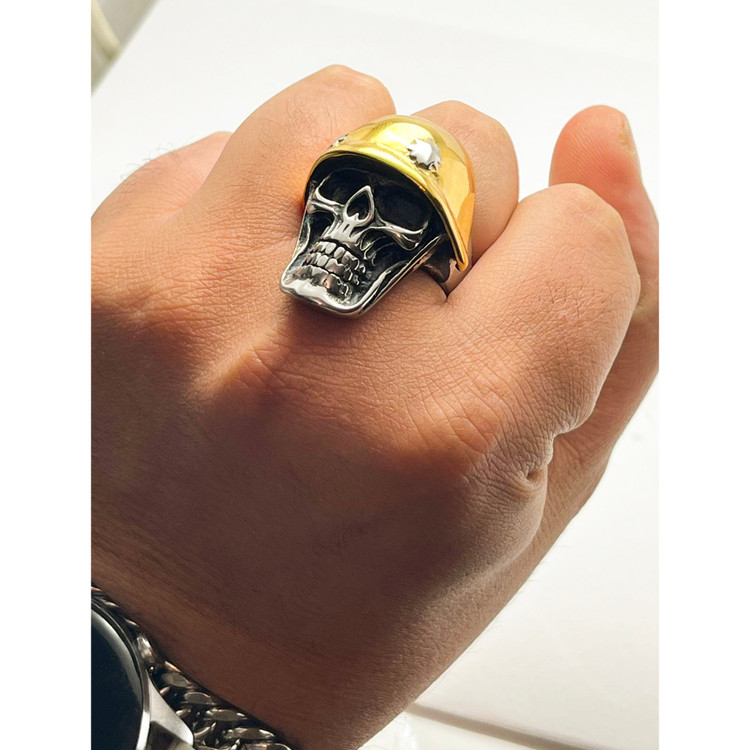 <img src="/images/steel-gang-ring.jpg" alt="انگشتر مردانه استیل طرح اسکلت با کلاه طلایی خیابانی - گالری عزیزی">