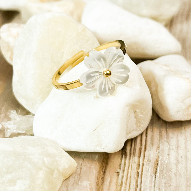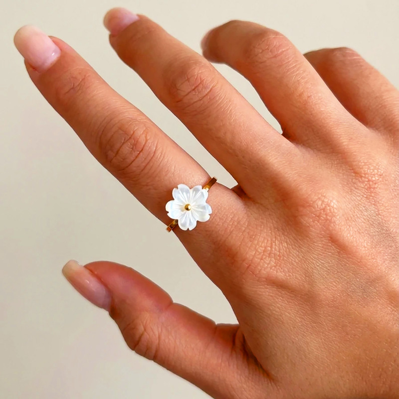 انگشتر زنانه مدل گل سفید از جنس استیل و صدف طبیعی است . گل روی انگشتر با هنر گوهر تراشی به این ظرافت در آمده است یک انگشتر بسیار ظریف و نازک است و گل روی انگشتر به صورت پینی روی رکاب نصب شده که باعث میشه گل روی انگشتر میچرخه و تکان میخورد . گزینه عالی برای کسانی است که زیورالات ریز با ظرافت بالا دوست دارند خواهد بود