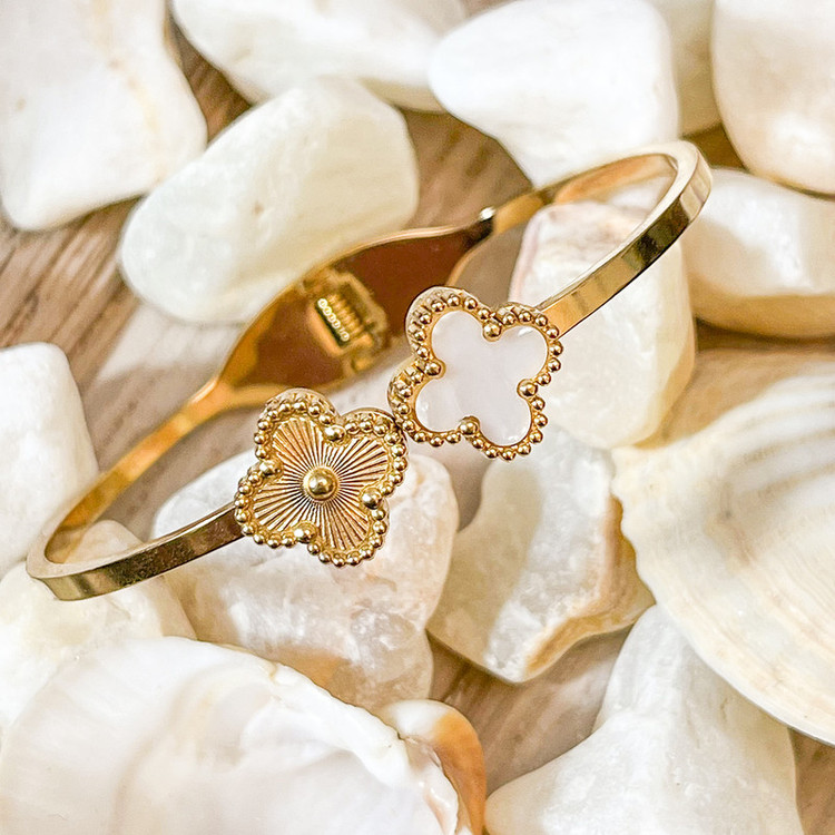 دستبند زنانه ون کلیف با طراحی شبدر چهار برگ، نماد شانس، ظرافت و خوشسلیقگی است. این دستبند با رنگ طلایی براق و المان صدفی، جلوهای لطیف و لاکچری به استایل شما میدهد و برای استفاده روزمره یا مهمانیهای خاص کاملاً ایدهآل است.