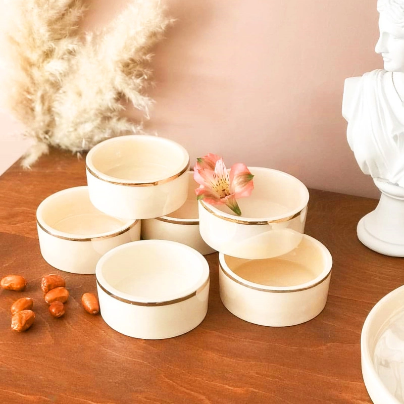ست کاسه مدل هور از جنس سرامیک و لاستر طلا است . این مجموعه 6 عددی کاسه جزو ظروف لوکس برای پذیرایی از مهمانان خواهد بود . رنگ سفید صدفی خاص این کاسه ها با نوار طلایی رنگی ک تزئین کرده دور کاسه ها را جلوه بسیار خاصی دارد . و نظر هر کسی را به خود جلب میکند و گزینه ایده الی برای سرو انواع تنقلات ،آجیل یا حتی ماست و سوپ در مهمانی های شما است .