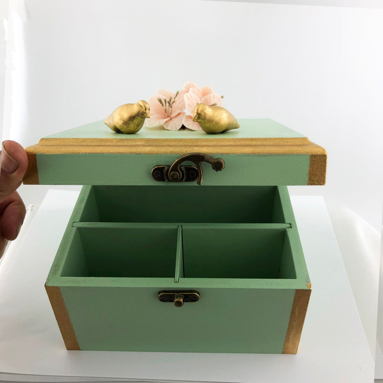 جعبه تی بگ طرح گل و پرنده از جنس چوب راش و گلسازی ایتالیایی است . این جعبه با طول و عرض 20 سانتیمتری و داشتن سه قسمت درون جعبه مناسب برای پذیرایی است . جعبه تی بگ با طراحی که دارد مناسب کسانی است که به دنبال جعبه پذیرایی لوکس و خاص هستند