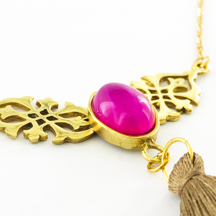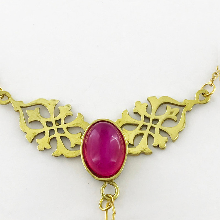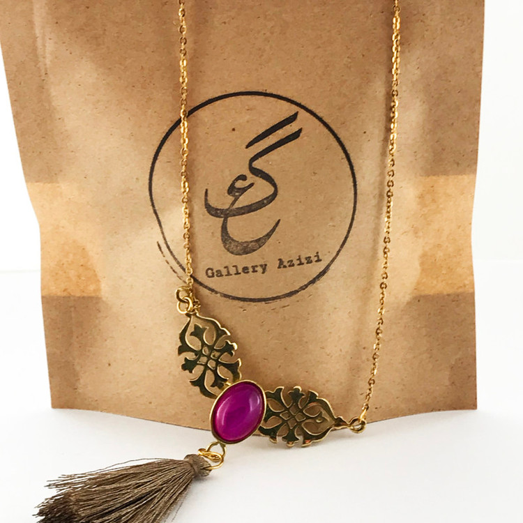 گردنبند زنانه گالری عزیزی مدل 99977 از جنس برنج و سنگ دلربا است . این گردنبندکاملا دستساز بوده و با تکنیک اره کاری جواهر ساخته شده است ، از طراحی تا ساخت آن توسط گروه هنری گالری عزیزی انجام شده است . و همین امر باعث گردیده کسانی که به دنبال کارهای خاص و منحصر به فرد هستند بتوانن انتخاب خوبی داشته باشند .